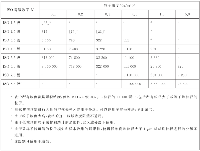 表E.1給出了所允許的非整數潔凈度等級。粒子測量上存在的不確定性使得級別增加不宜低于0.5,表中的腳注說明了由于采樣和粒子采集的局限性而帶來的限制條件。
